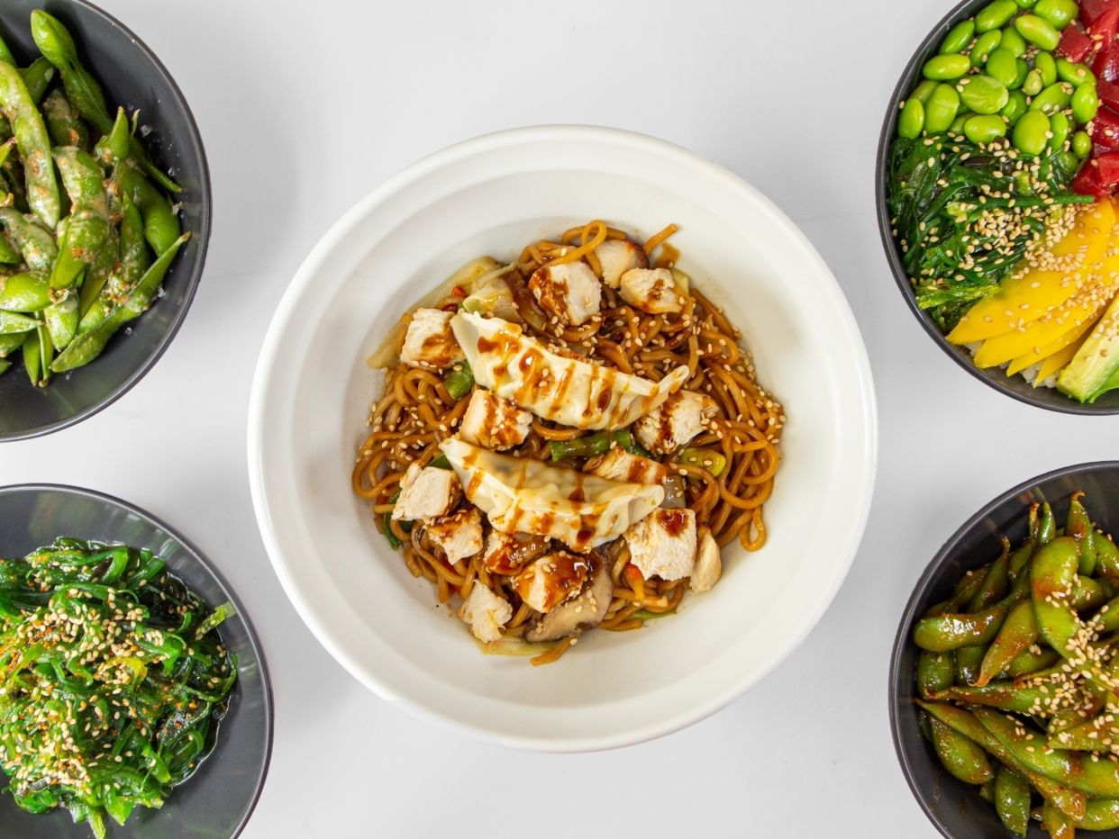 Arroz de sushi, mango, aguacate, edamame, ensalada goma wakame, tofu, gyozas verdura, salsa de poke (opción picante)