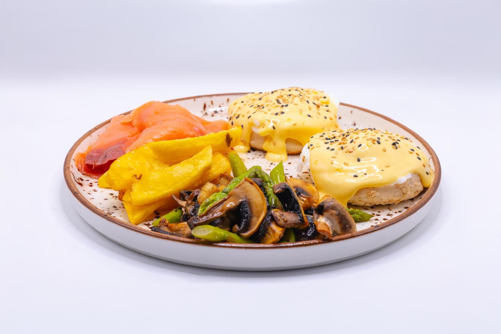Base de pan inglés clásico, huevos pochados con salsa holandesa, acompañados con mix de espárragos con champiñones salteados y patatas