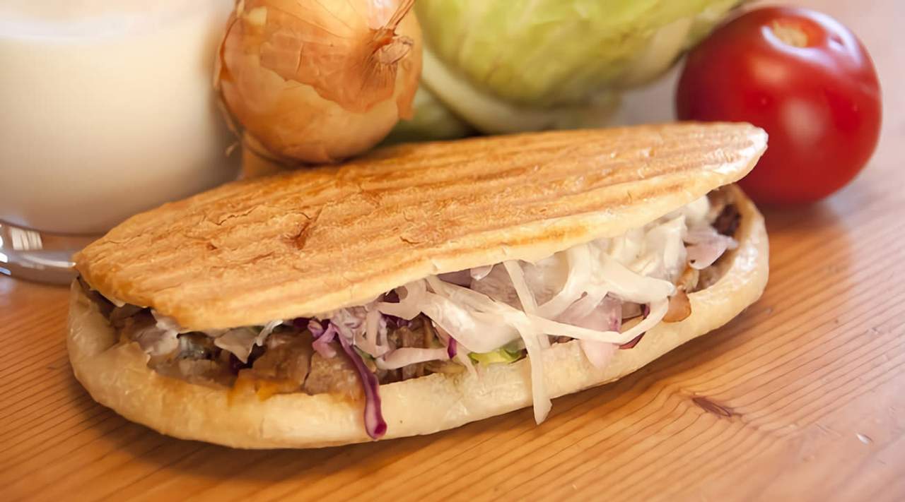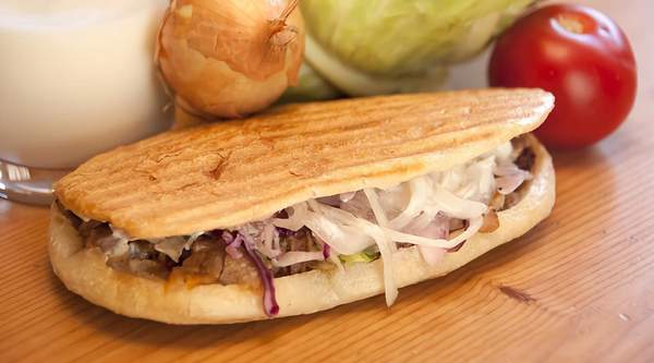 Salsa yogurt, carne shawarma, lechuga, cebolla, tomate y queso
