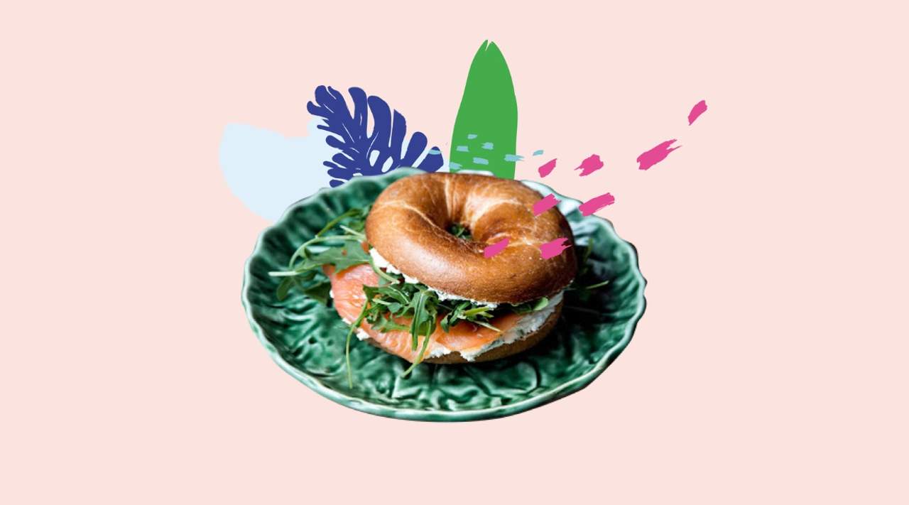Bagel de salmón ahumado, queso crema y rúcula acompañado de infusión a elección.