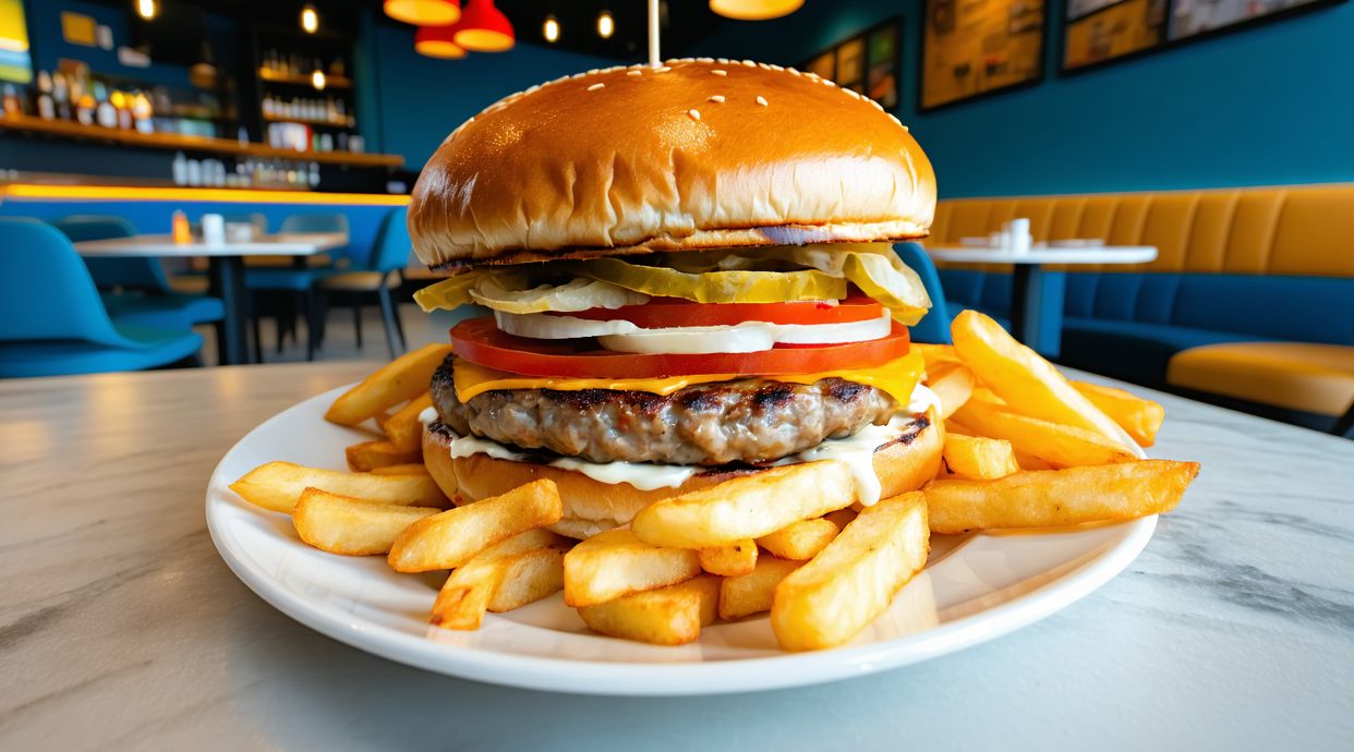 La que siempre gusta: Burger de 80 g. de carne, queso cheddar, lechuga batavia, tomate, cebolla roja, pepinillo y salsa mayonesa. No incluye patatas fritas