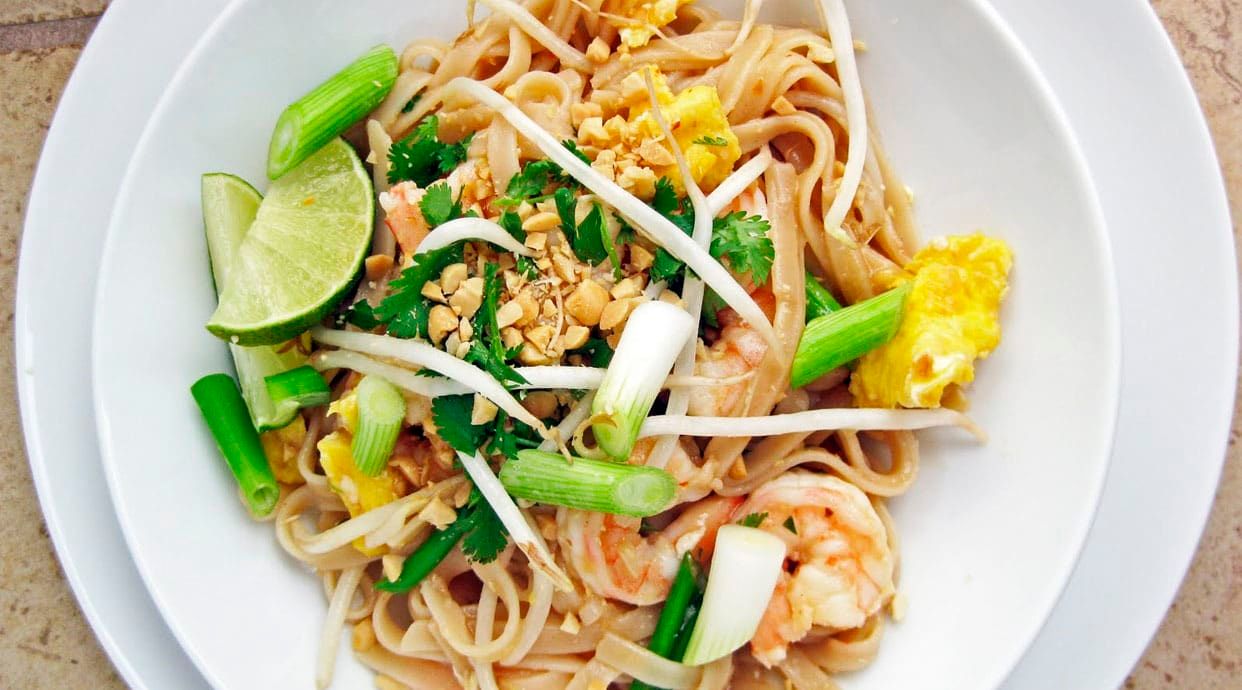 Receta thai original con salsa de la casa, brotes de soja, lima y cacahuetes tostados