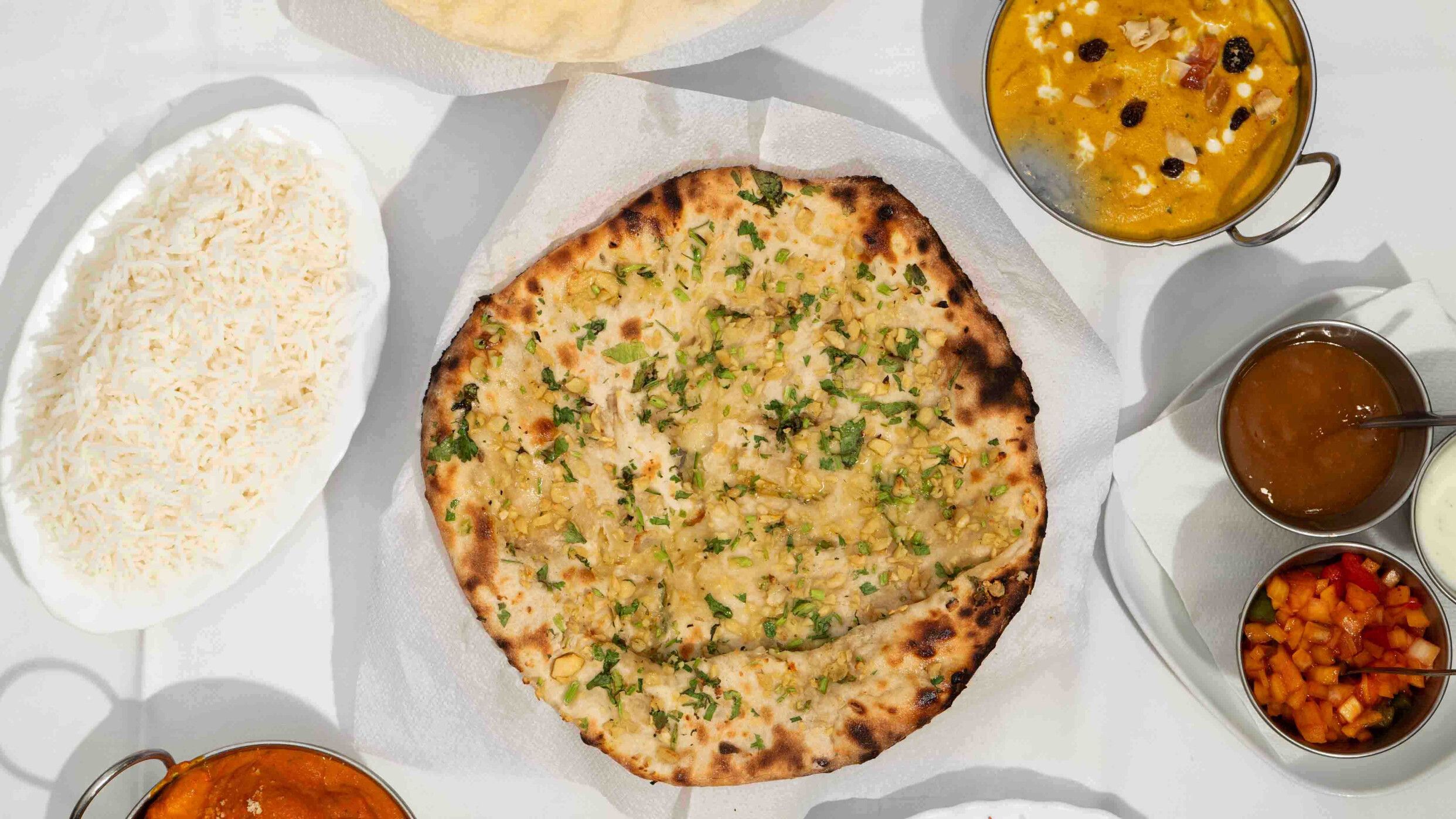 Gambas cocinadas con salsa, hierbas frescas y servidas con pan indio frito