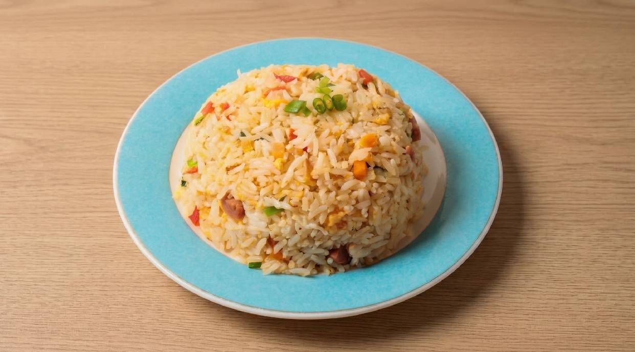 Arroz frito tradicional con jamón, tortilla y guisantes
