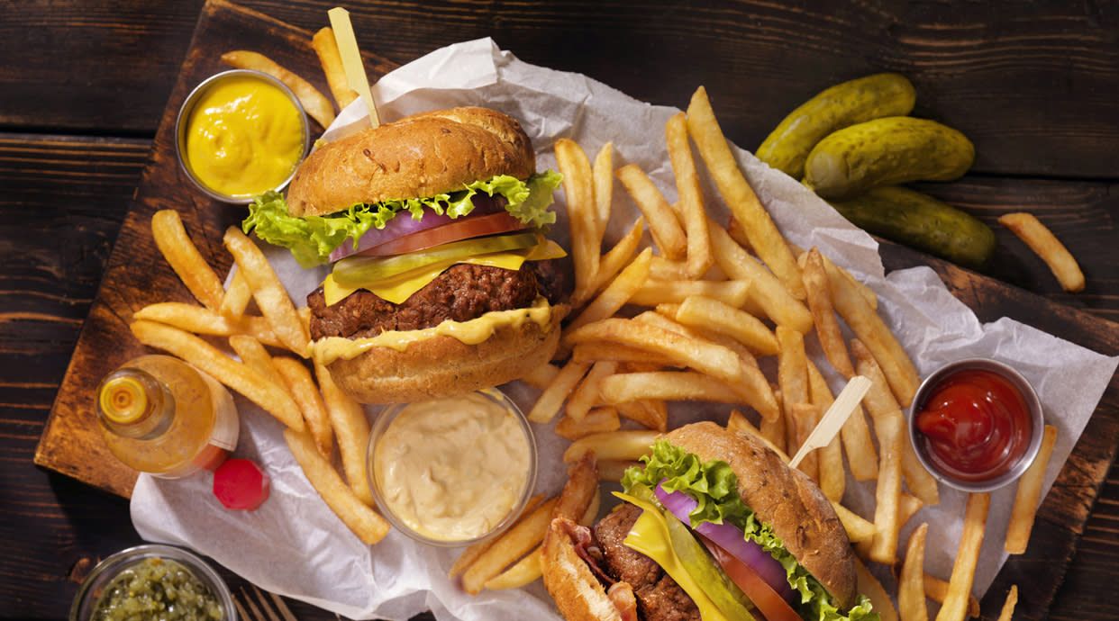 Carne de vaca (180 g.), con lechuga, tomate, cebolla caramelizada, huevo, bacon, magreta y queso cheddar con patatas fritas