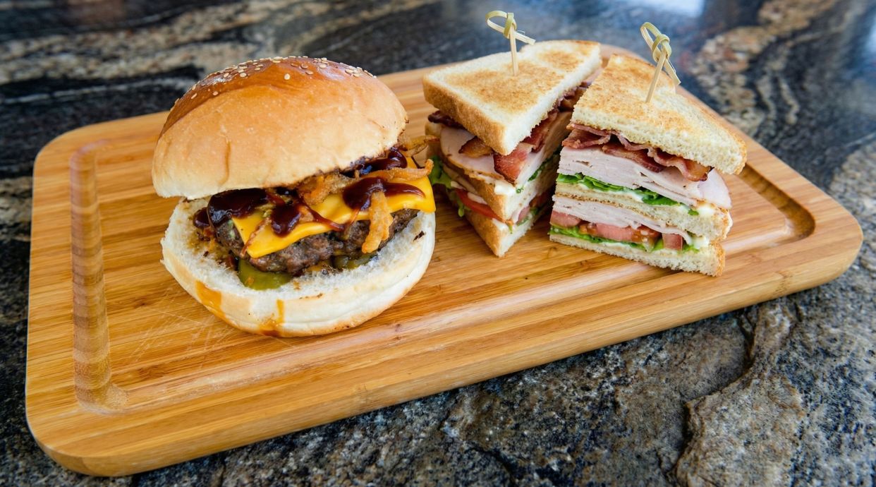 Pan brioche, carne de ternera y pollo, bacon, queso, cebolla caramelizada, lechuga, tomate en rodajas y salsa de la casa