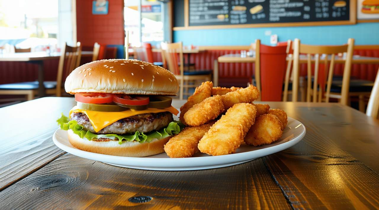 Pan, hamburguesa, queso, lechuga, tomate y cebolla