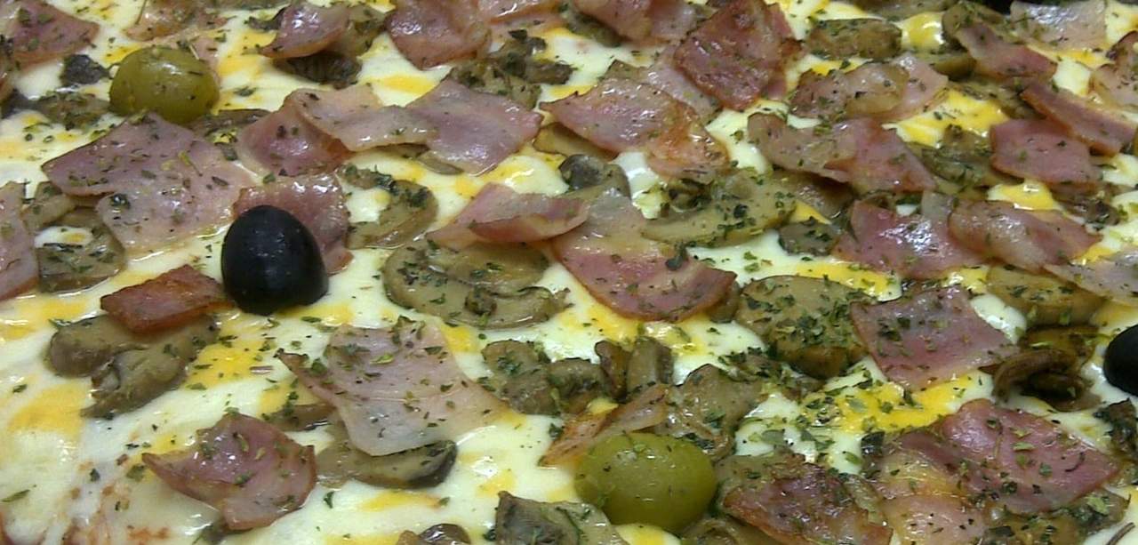Pizza 26cm. con mozzarella, aceitunas , orégano, york y bacon.