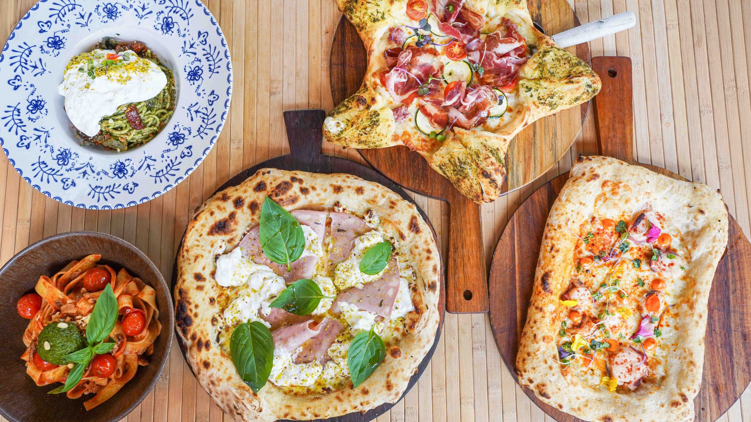 Pizza en forma de estrella, con bordes relleno de ricotta, flores de coppa di Parma, mozzarella fresca, salchicha italiana, tomates cherrys, calabacín y pesto.