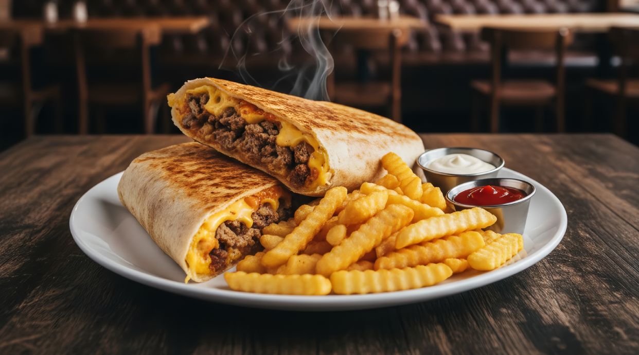 Taco de ternera con queso fundido, patatas fritas y salsa blanca salsa roja salsa de queso y queso todo dentro ala plancha. (todas las salsas van dentro del taco). Incluye patatas fritas bebida (fanta de naranja, sprite, fanta de limón).