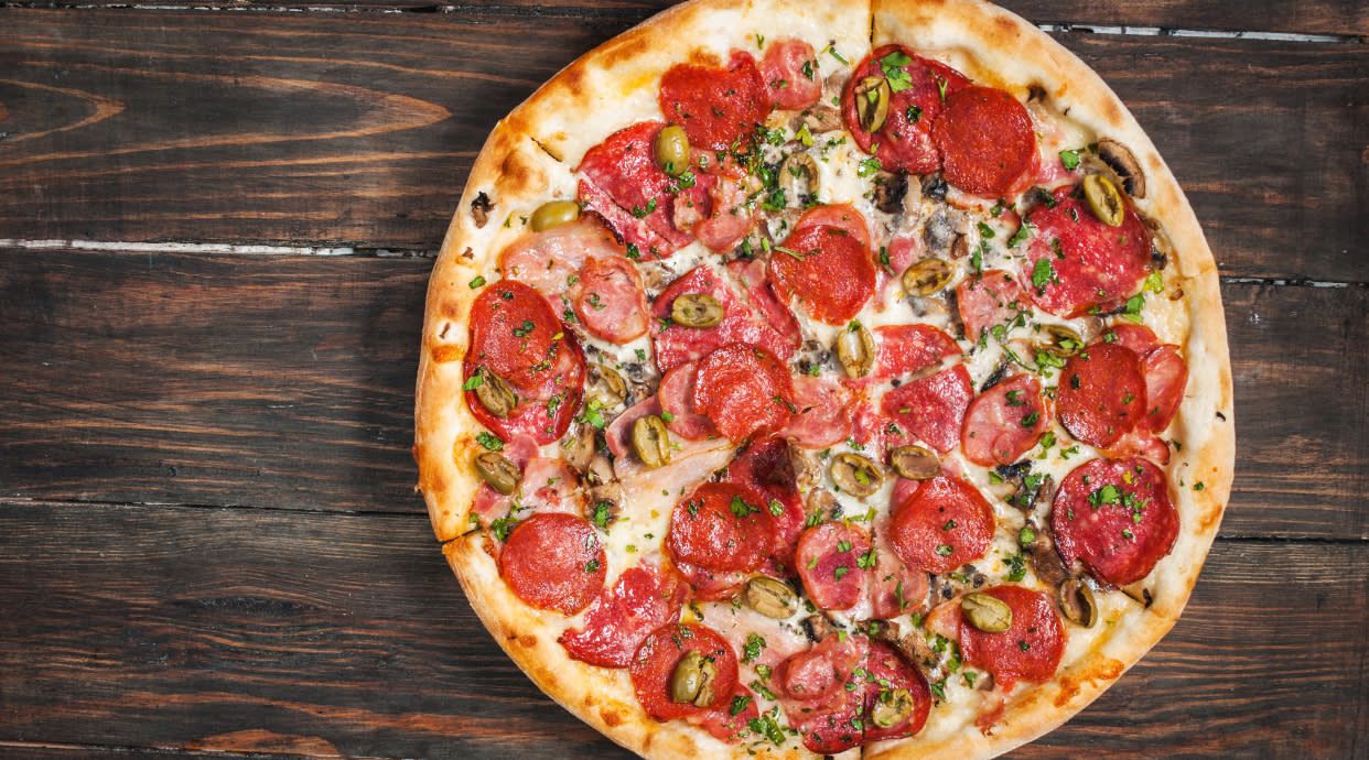 Con jamón, champiñones, cebolla, pepperoni, atún y aceitunas