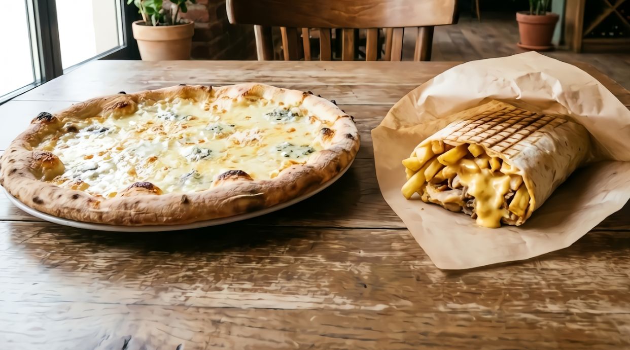Salsa de tomate, mozzarella, queso azul, queso parmesano y queso de cabra
