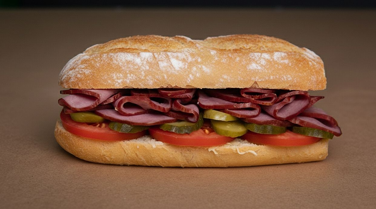 Jamón con tomate rallado y aceite de oliva. Sencillez, producto y sabor auténtico en un bocadillo clásico que nunca falla.