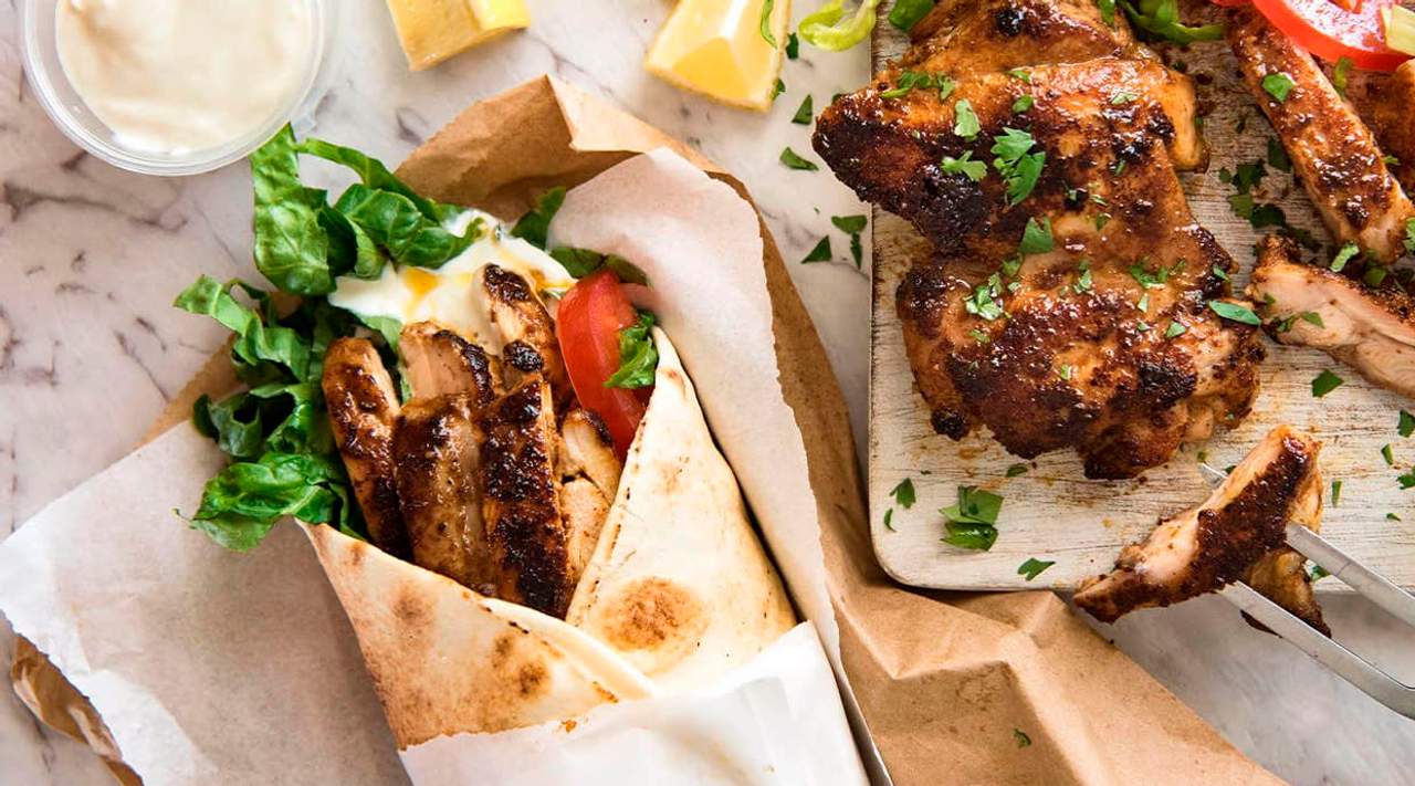 Carne de pollo, verduras, salsa, pan turco, patatas fritas y arroz