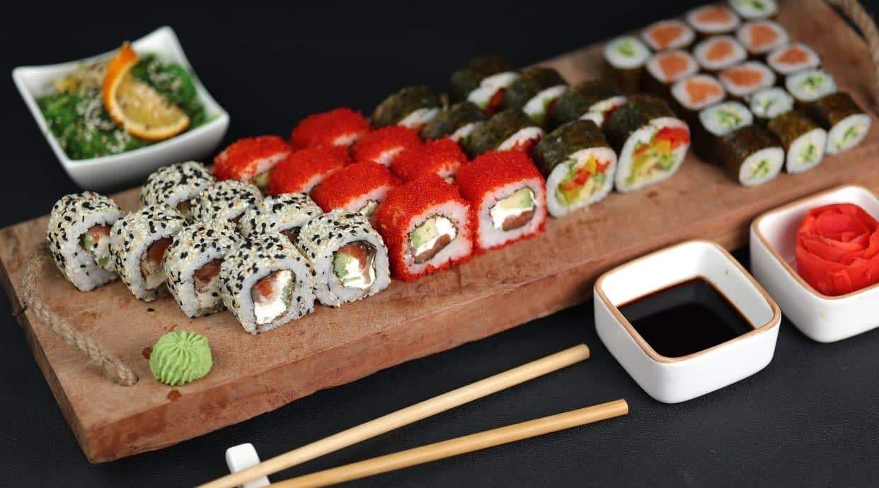 40 ნაჭერი,(1.500კგ) კალიფორნია ორაგულით, საკე უნაგი, იასაი როლი, საკე მაკი, კაპა მაკი, ჰიაში სალათი, ჯინჯერი, ვასაბი, სოიოს სოუსი