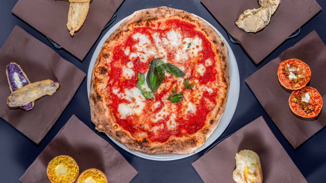 Pizza prima fritta e poi al forno, pomodoro San Marzano D.O.P. fior di latte di Napoli, pecorino romano buccia nera D.O.P, basilico