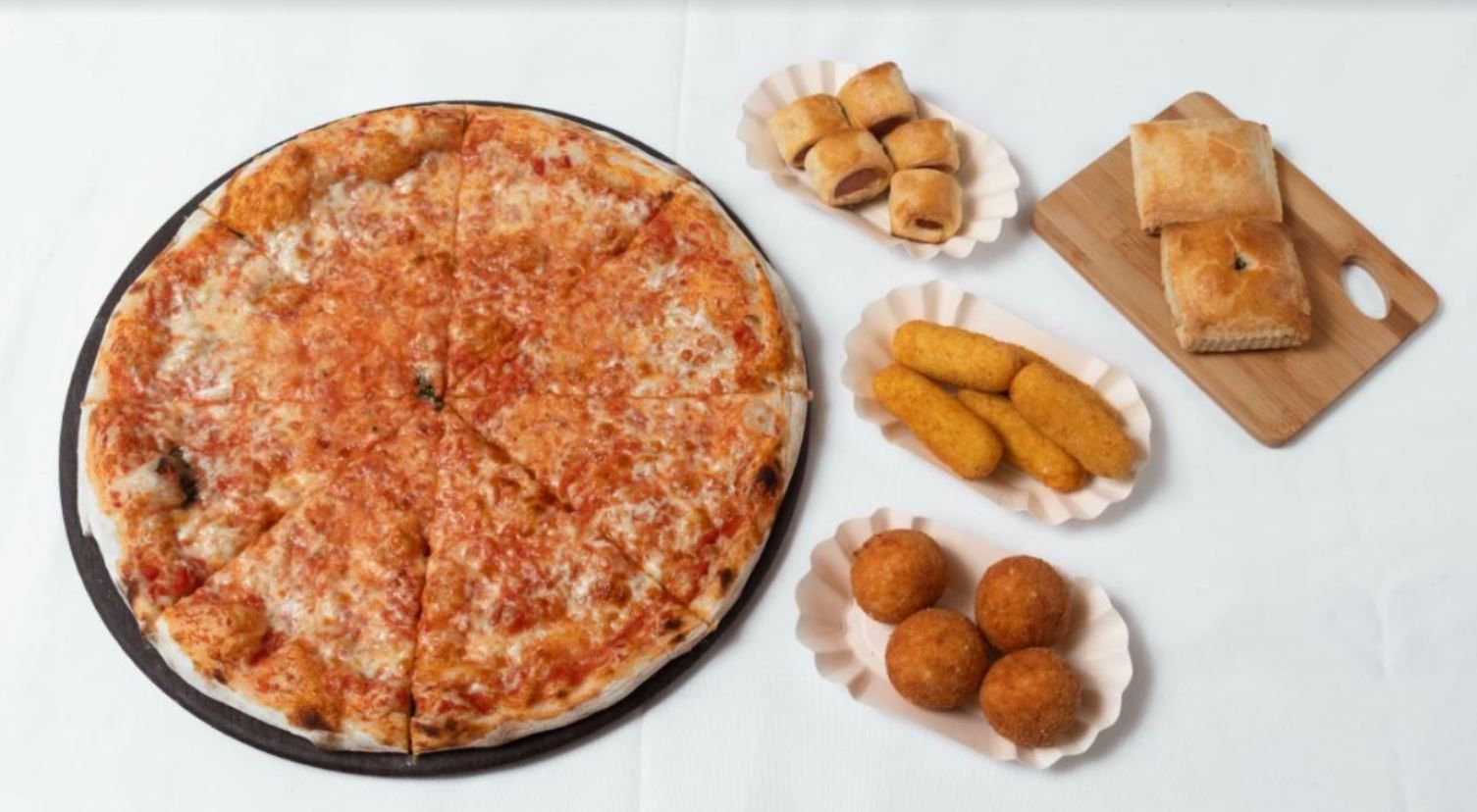 Pomodori pelati, scamorza Bagnolese, cipolla, peperoni, funghi, carciofi, salsiccia piccante, origano e basilico