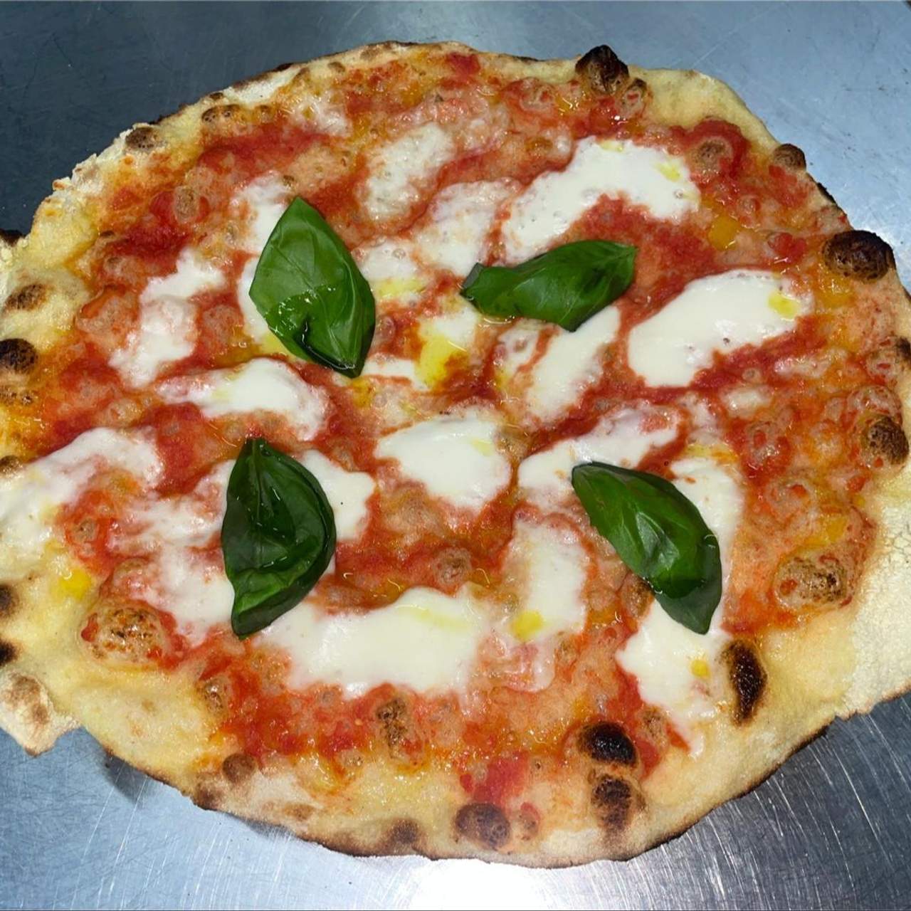 Salsa pomodoro bio, mozzarella artigianale “Le 4 More”, basilico, olio EVO
