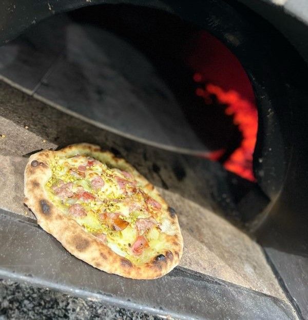 Crema di pistacchio, mozzarella, bacon e scaglie di parmigiano