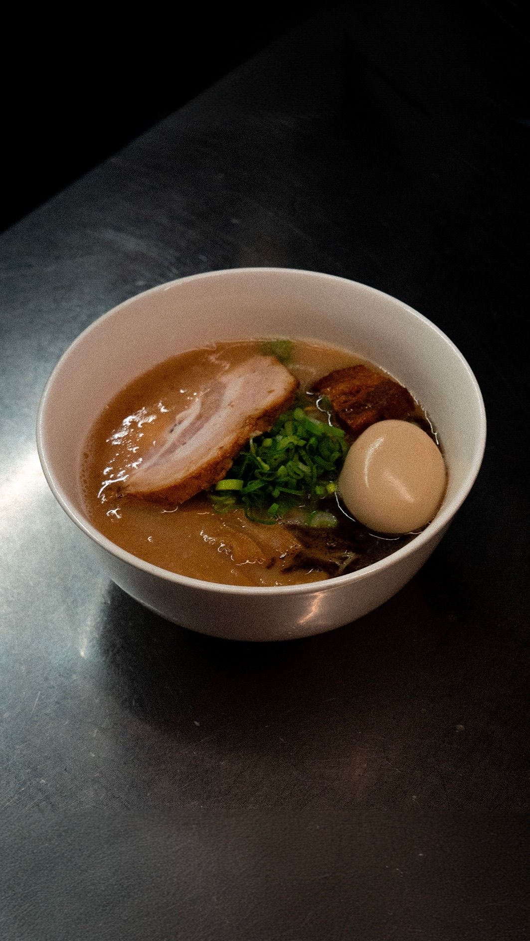 Brodo saporito e intenso di maiale, noodles fini, chashu, kakuni, cipollotto, germogli di soia, menma (germogli di bambù fermentati), mayu (olio di aglio bruciato)