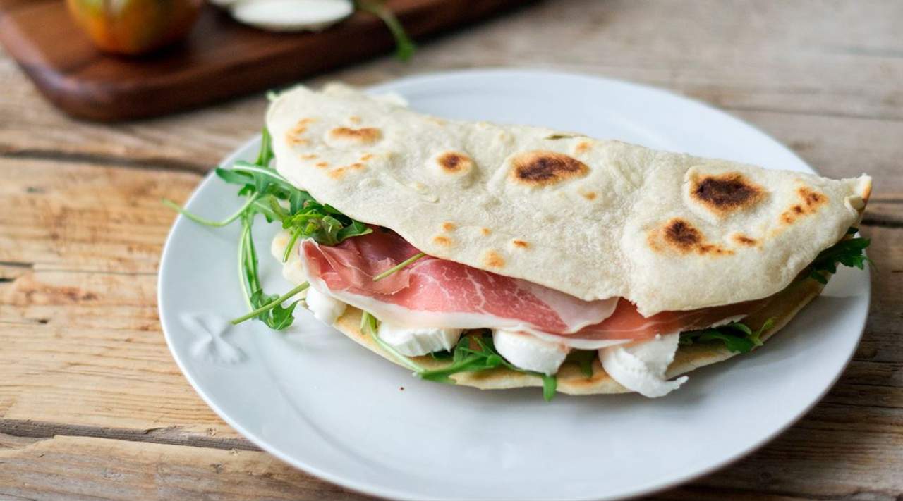 Metà piadina farcita con 100gr di tartare di manzo, grana, lattuga e dressing a scelta, metà piadina farcita con tris di verdure grigliate, zucchine, melanzane e peperoni dolci e provola affumicata