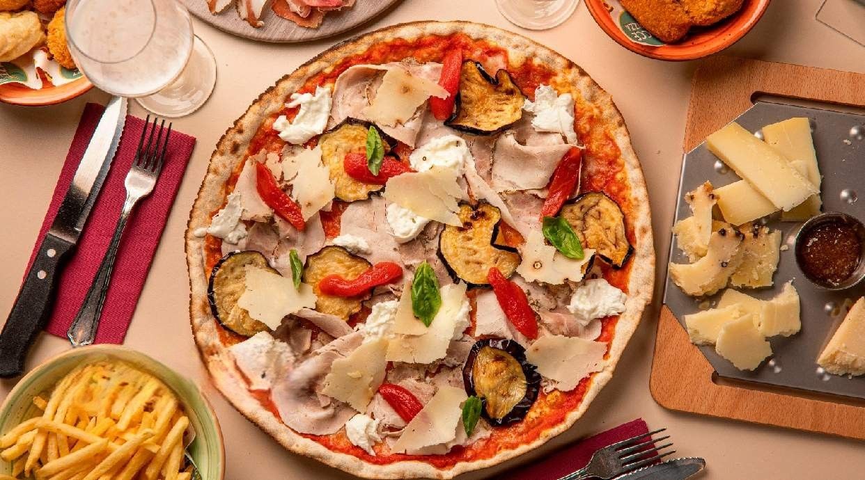 Mozzarella fior di latte “Sorrentina”, porchetta naturale trevigiana “Da*Pian”, melanzane al forno, scaglie di Pecorino stagionato “Di Sicilia”, filo di miele di acacia.