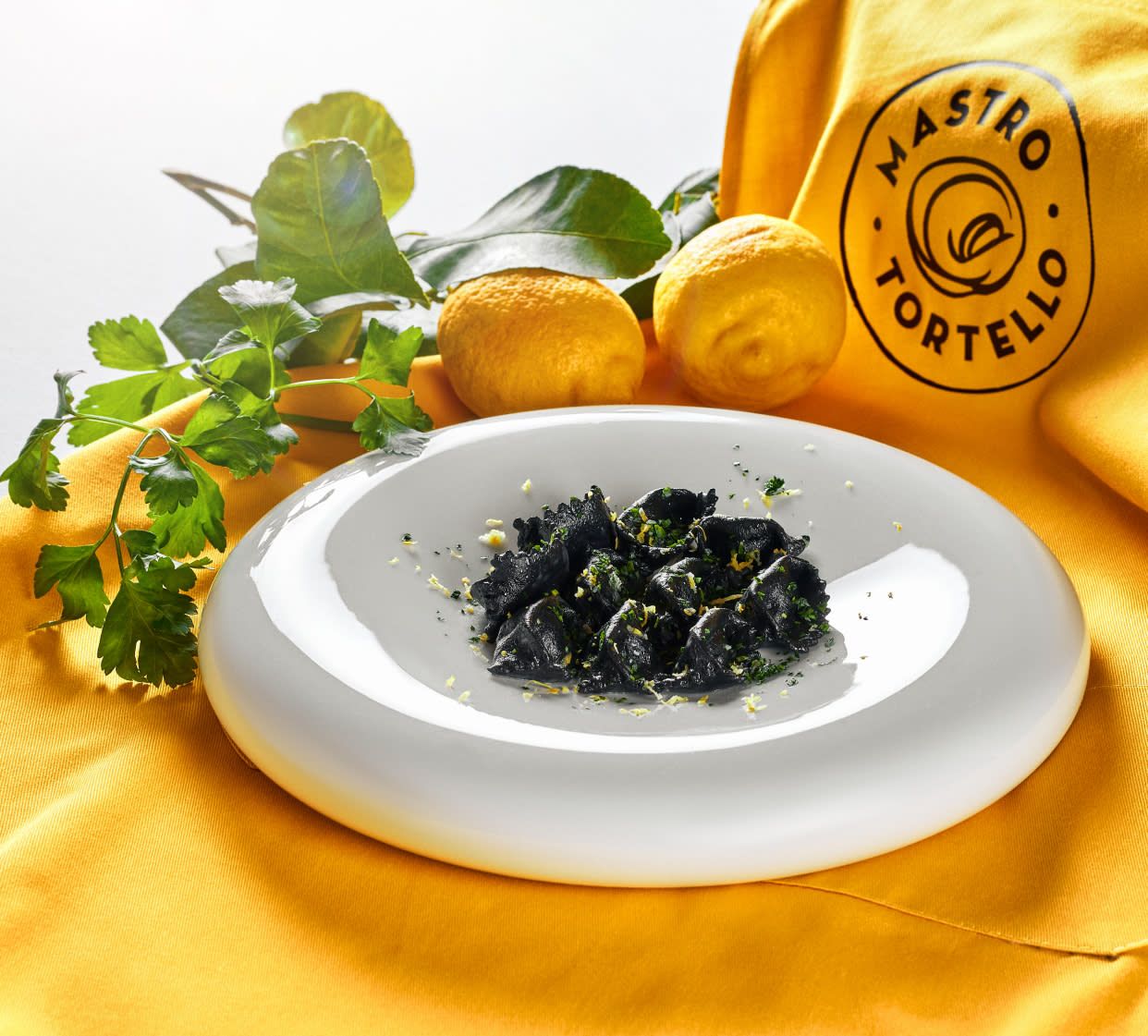 Impasto: mastrotortello nero ai 33 tuorli con carbone vegetale, senza albumi, né acqua Ripieno: crema al salmone Condimento: scorza di limone, olio EVO a crudo Allergeni: Glutine, Uova, Latte, Pesce