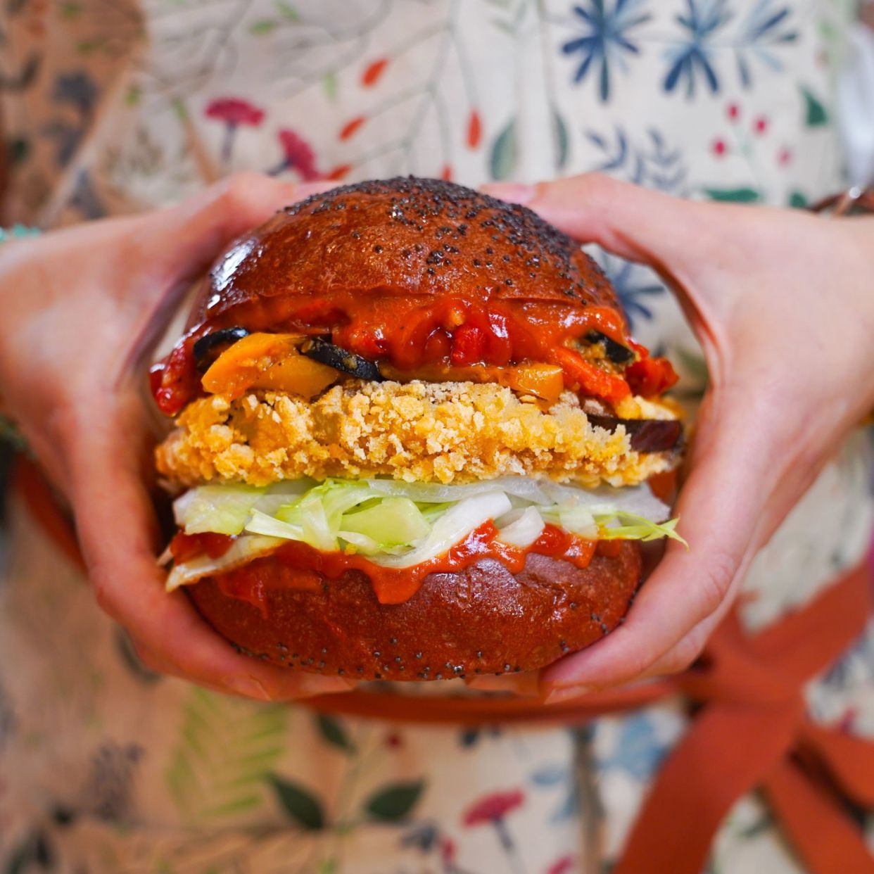 Panino con Burger di Fagioli e Avena con Bacon di Carote homemade, Provola vegetale, Pomodori secchi, Salsa Yogurt all'Aglio