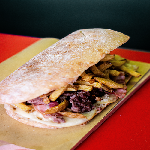 Provola, porchetta, bacon, crema di tarallo e maionese