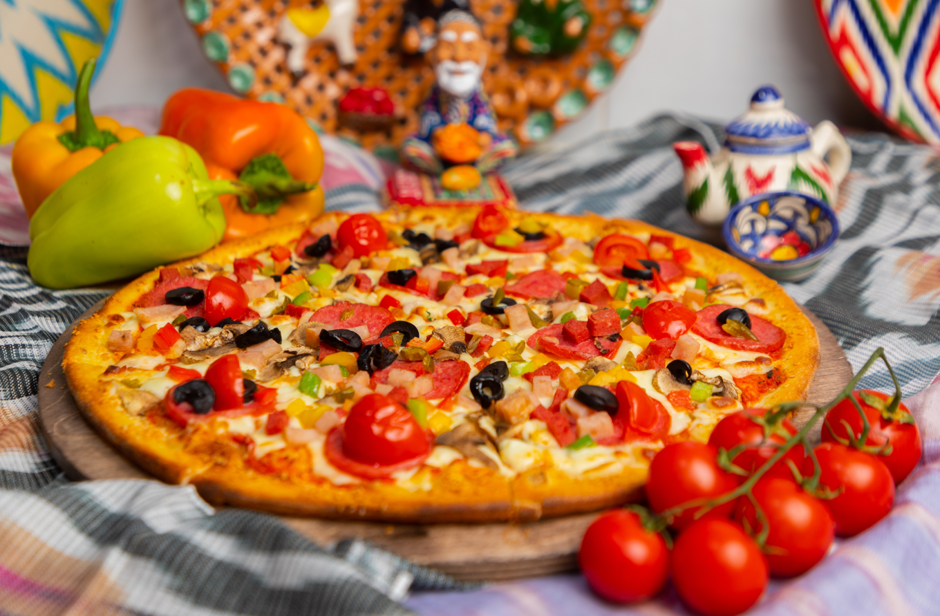 Pomodoro, mozzarella, prosciutto, funghi, carciofini, olive nere