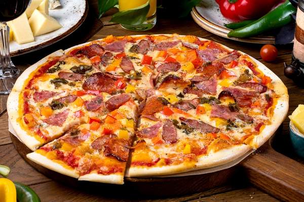 Pomodoro, mozzarella fiordilatte, prosciutto cotto, carciofi, funghi, würstel, olive nere, basilico e olio extravergine d'oliva