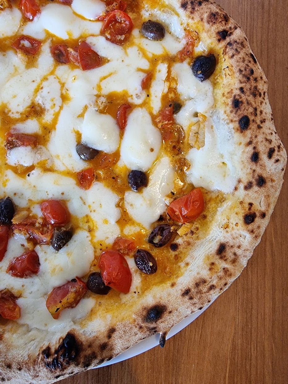 Pomodoro pelato italiano, fiordilatte dei Monti Lattari, prosciutto cotto, carciofini grigliati, olive nere di Gaeta, uovo sodo, basilico, olio evo San Comaio