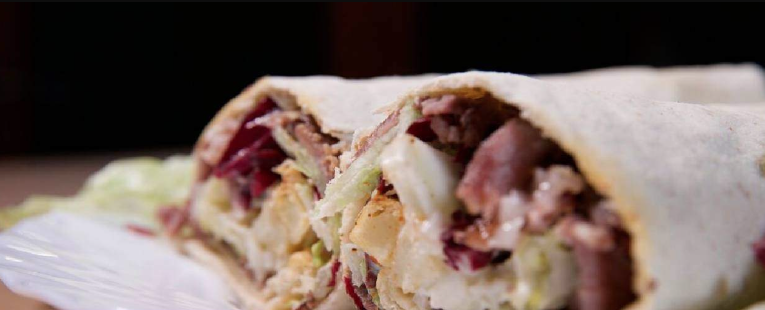 Carne di kebap arrotolato in una piadina con sugo di pomodoro, burro e yogurt naturale con aglio