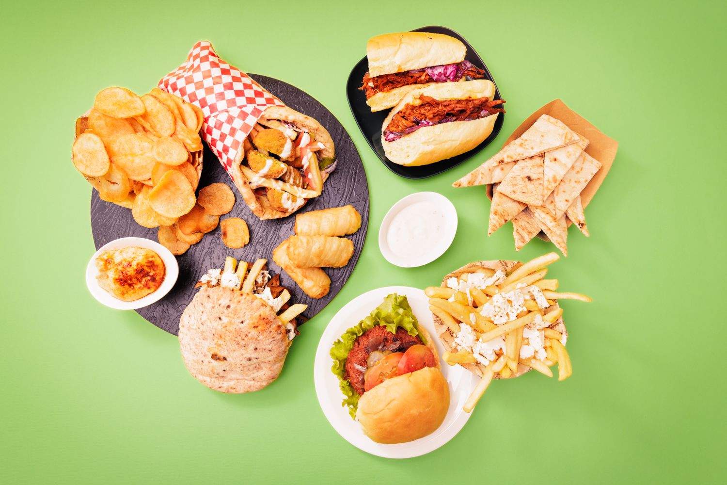 Falafel, misticanza, mix di pomodoro e cipolla a cubetti, un tocco di hummus, croccanti patate fritte e le tue salse a scelta. Il menù comprende croccanti chips skin on di Lamb Weston.