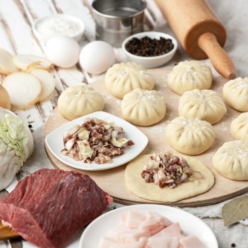 Pane cinese cotto al vapore con cestelli di bambù. Impasto di farina BIO tipo "0" e integrale, fermentato con lievito BIO. Ripieno di carne di maiale provenienza biodinamica, verza, erba cipollina e zenzero fresco