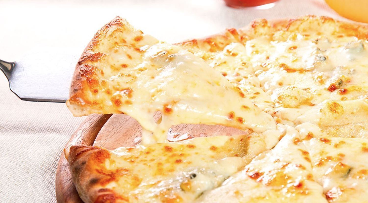 Mozzarella fiordilatte, formaggio svizzero, emmental, gorgonzola, basilico e olio