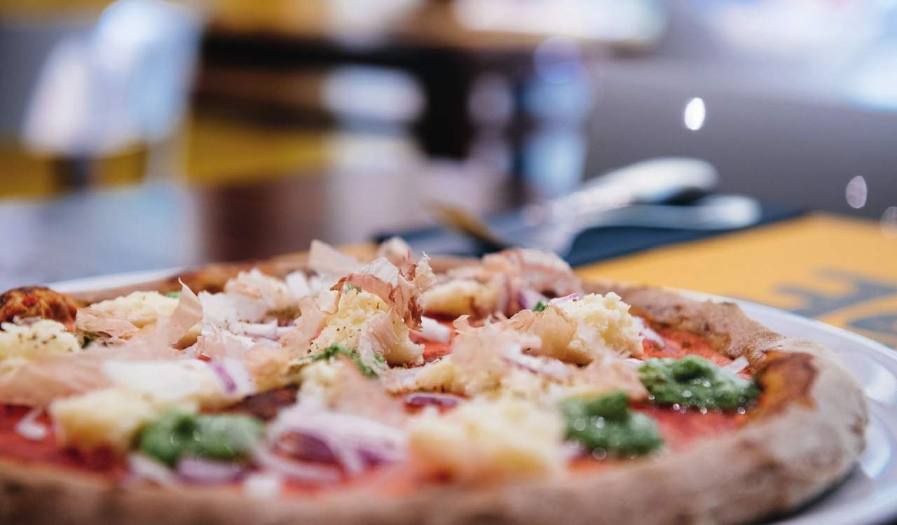 Bufala, pomodorini, rucola, olio all’aglio, mascarpone, guanciale di Sauris, Grana Padano