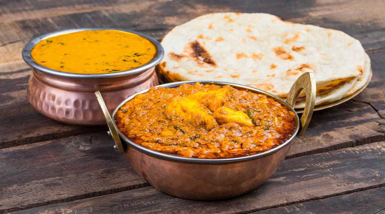 Rich mutton curry made with tomatoes, onions, belles peppers & traditional Indian spices cooked in a wok.