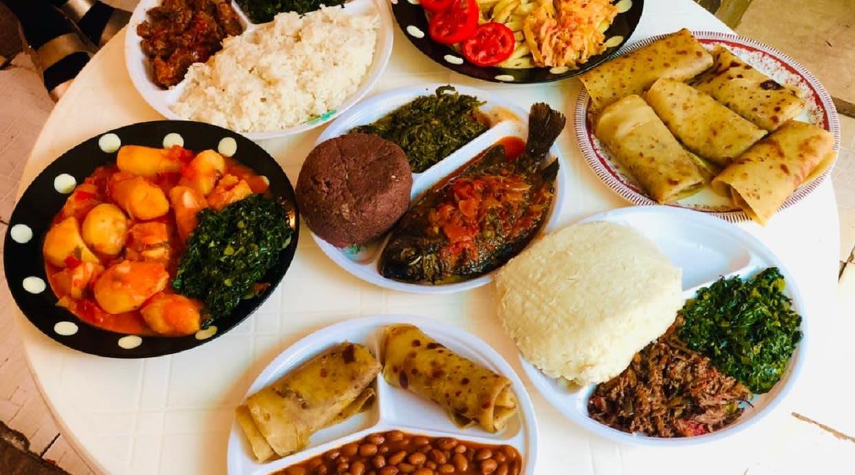 Whole fish, onion rings, fresh ginger root, garlic, turmeric and ugali