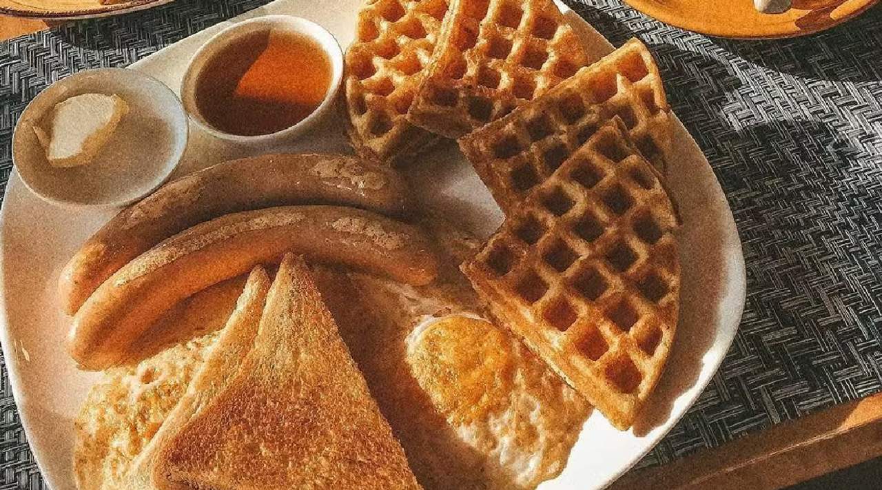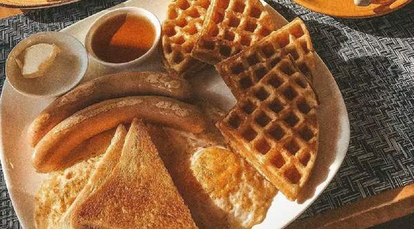 Яичница, тост, на выбор панкейки или вафли и на выбор ветчина или сосиска