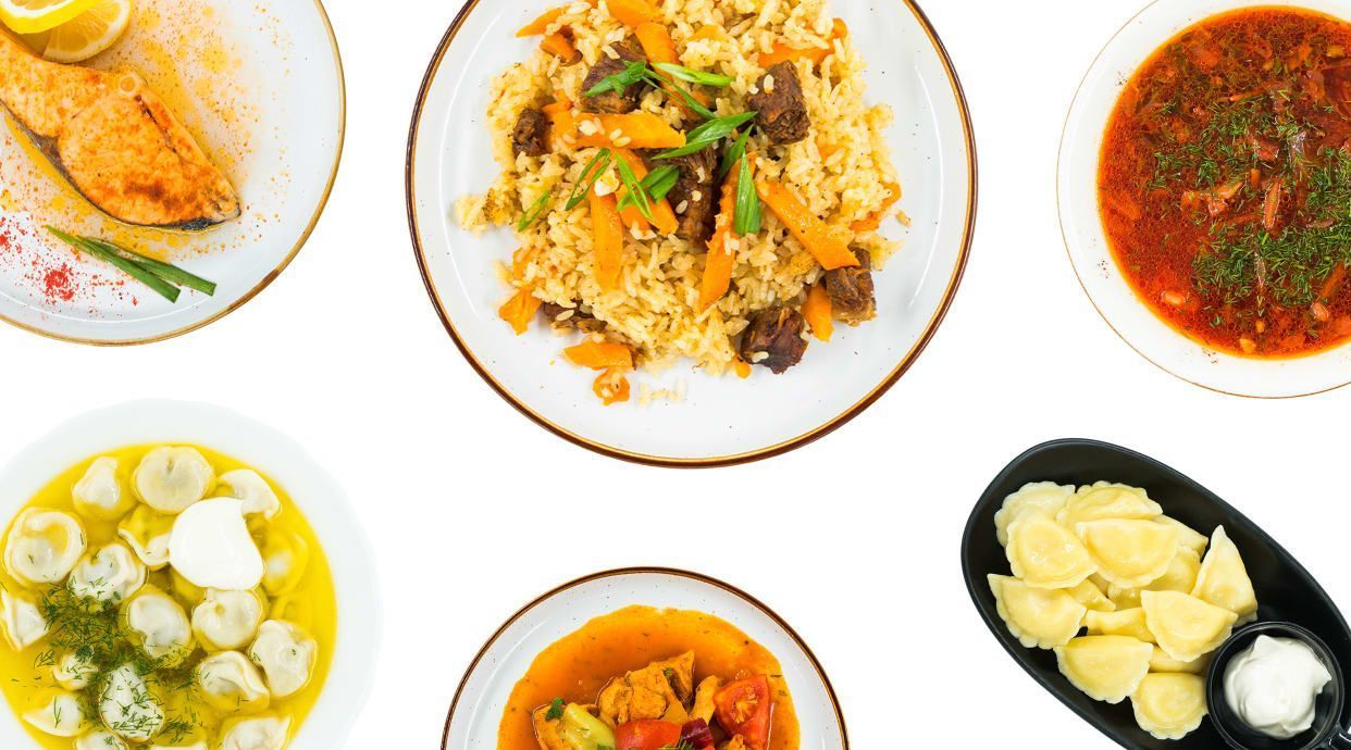 Суп лапша из курицы Куырдак из конины Лепешка 1 шт Салат Винегрет Вода Asu 0.5 б/г