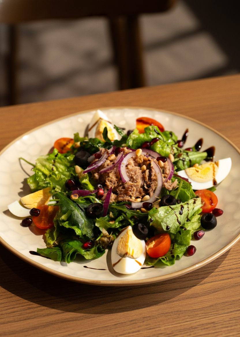 Фирменный салат из тунца в масле с яйцом, каперсами, оливками и помидорами черри. Приправлен оливковым и апельсиновым соусами.