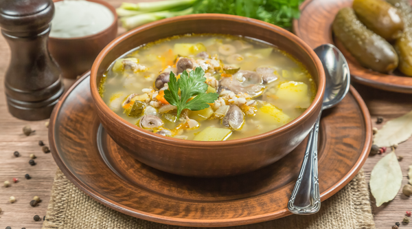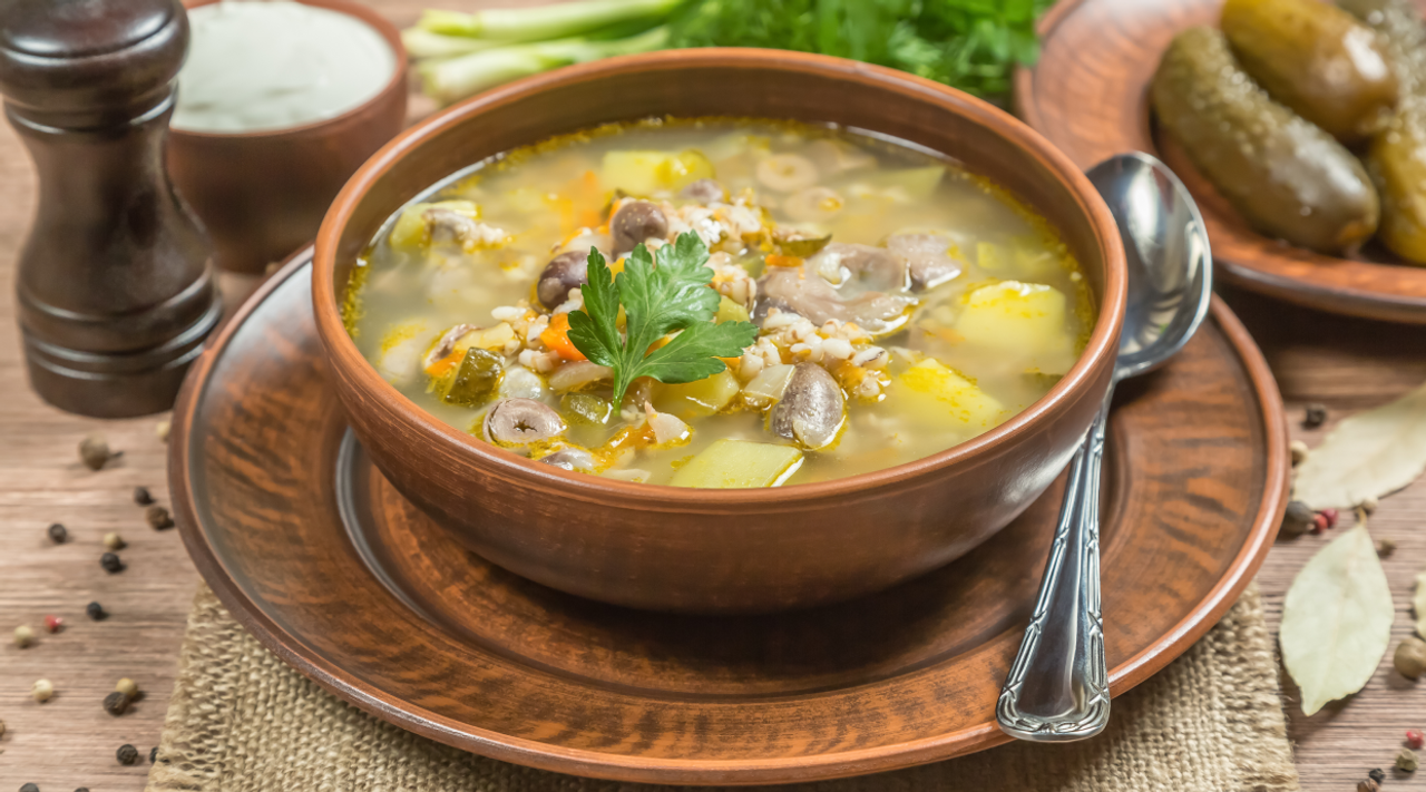 Говядина, перловая крупа, томатная паста, соленые огурцы, картофель, лук, морковь, зелень
