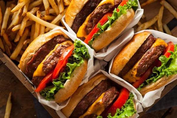 Булочка, две говяжьи котлеты, маринованный огурец, ломтик сыра, репчатый лук, салат, кетчуп, майонез
