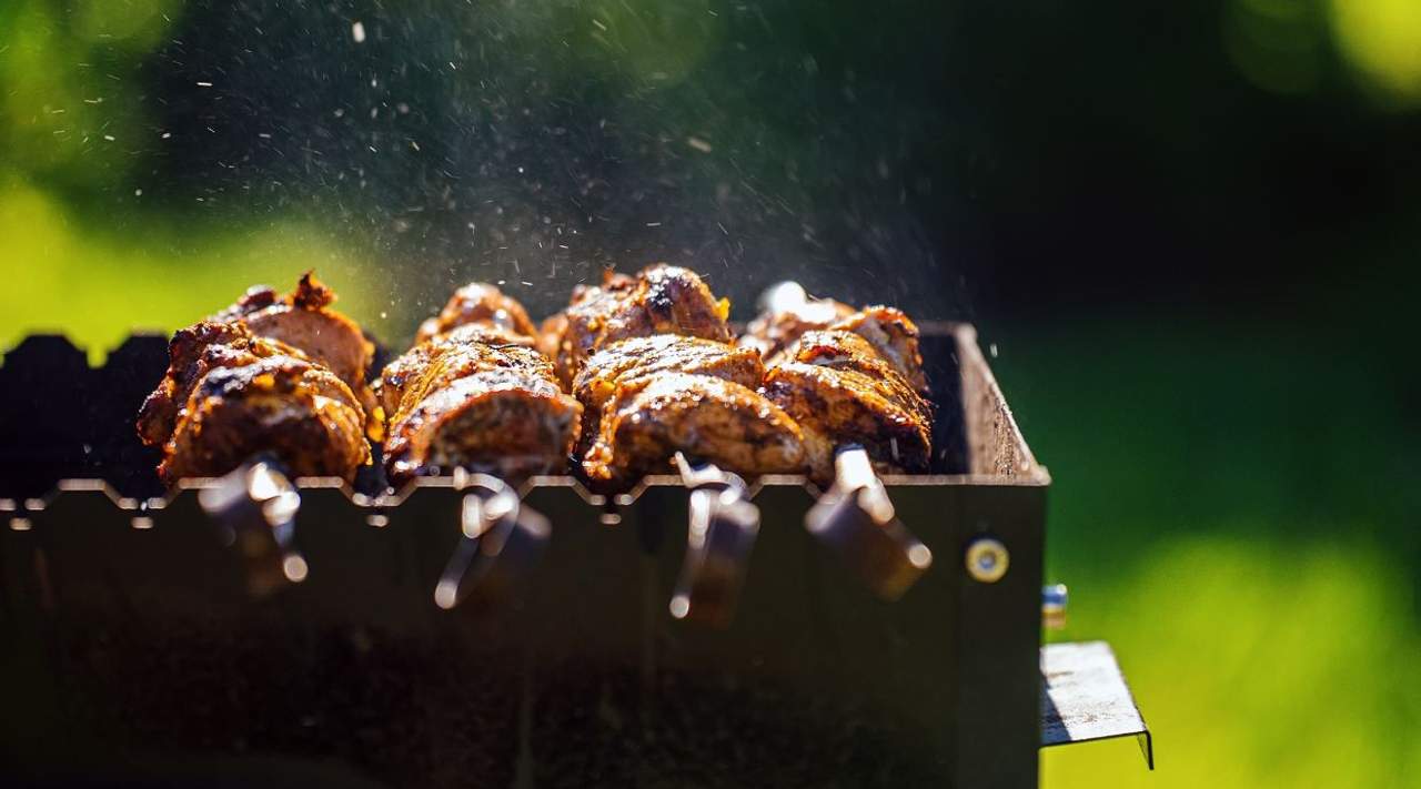 Шашлык из куриной грудки, крылья, цыпленок, куриные колбаски, картофельные дольки, шампиньоны гриль