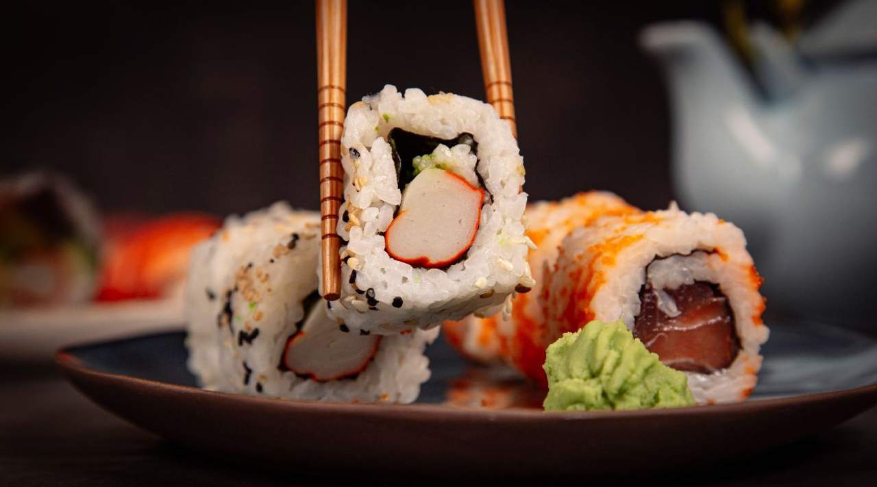 Лосось, угорь, креветка, сливочный сыр, икра тобико, огурец