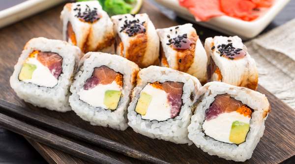 Рис, лосось, угорь, авакадо, сыр твороженный, лист салата с нори, обжаренный в кляре