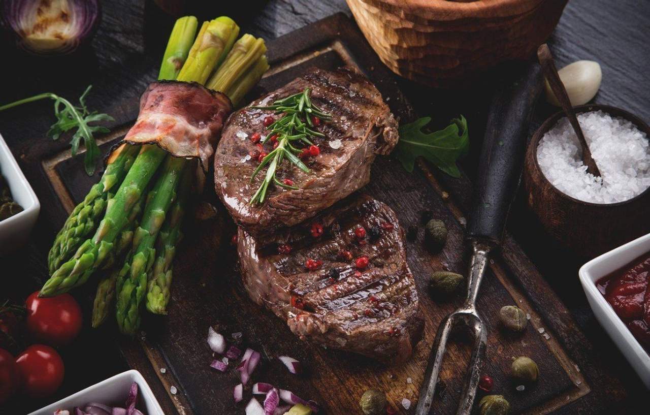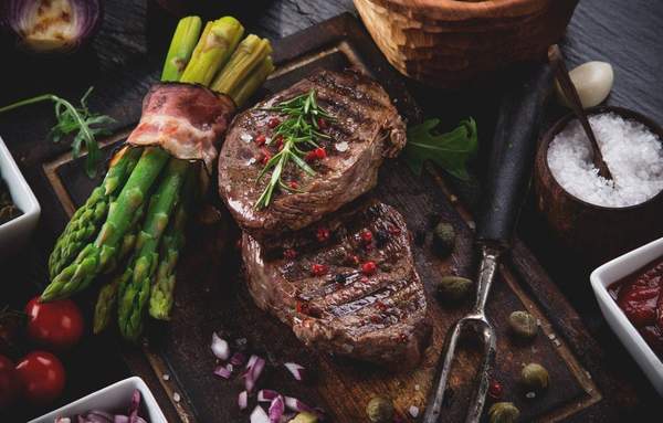 Рибай, соль, перец горошек, розмарин ,чеснок, сливочное масло, перец халапеньо, бальзамик крем, розовый перец, зелень в ассортименте, черри, соус "Сальс"