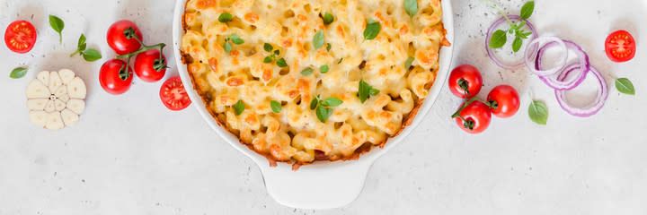 Pasticcio savoureux, sauce bolognaise et béchamel, fromage, doré au four.