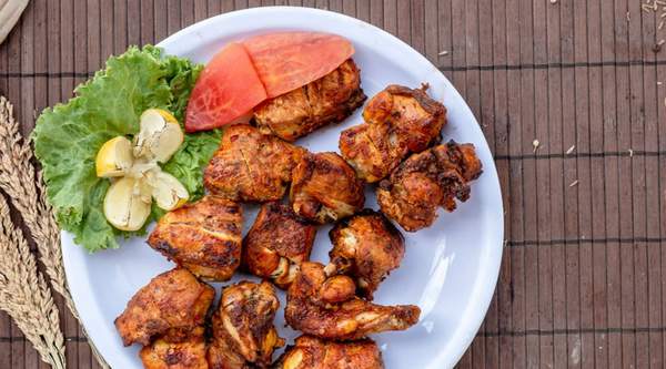 z czosnkiem, imbirem oraz bukietem różnorodnych przypraw. Podawane z sałatką.